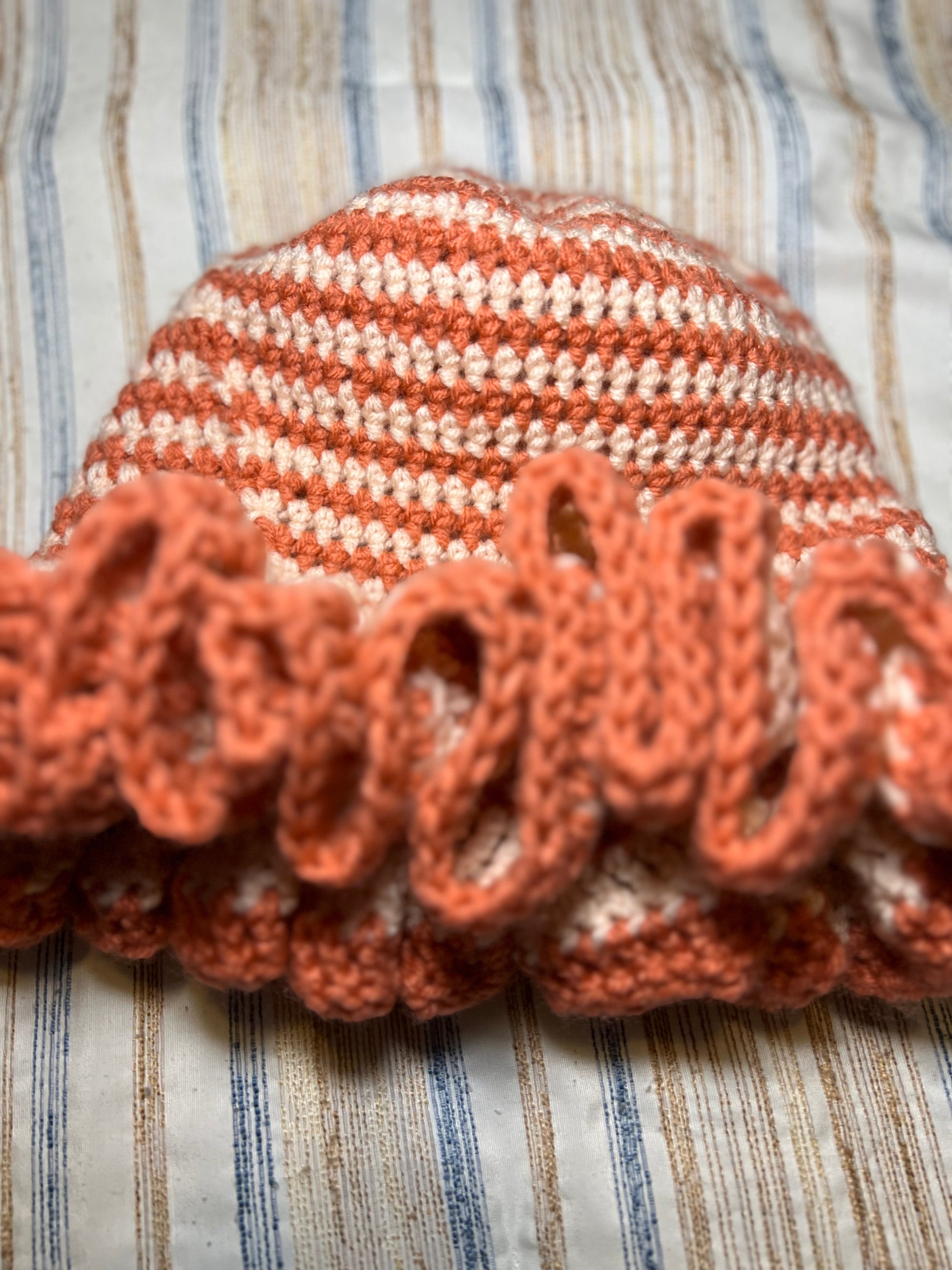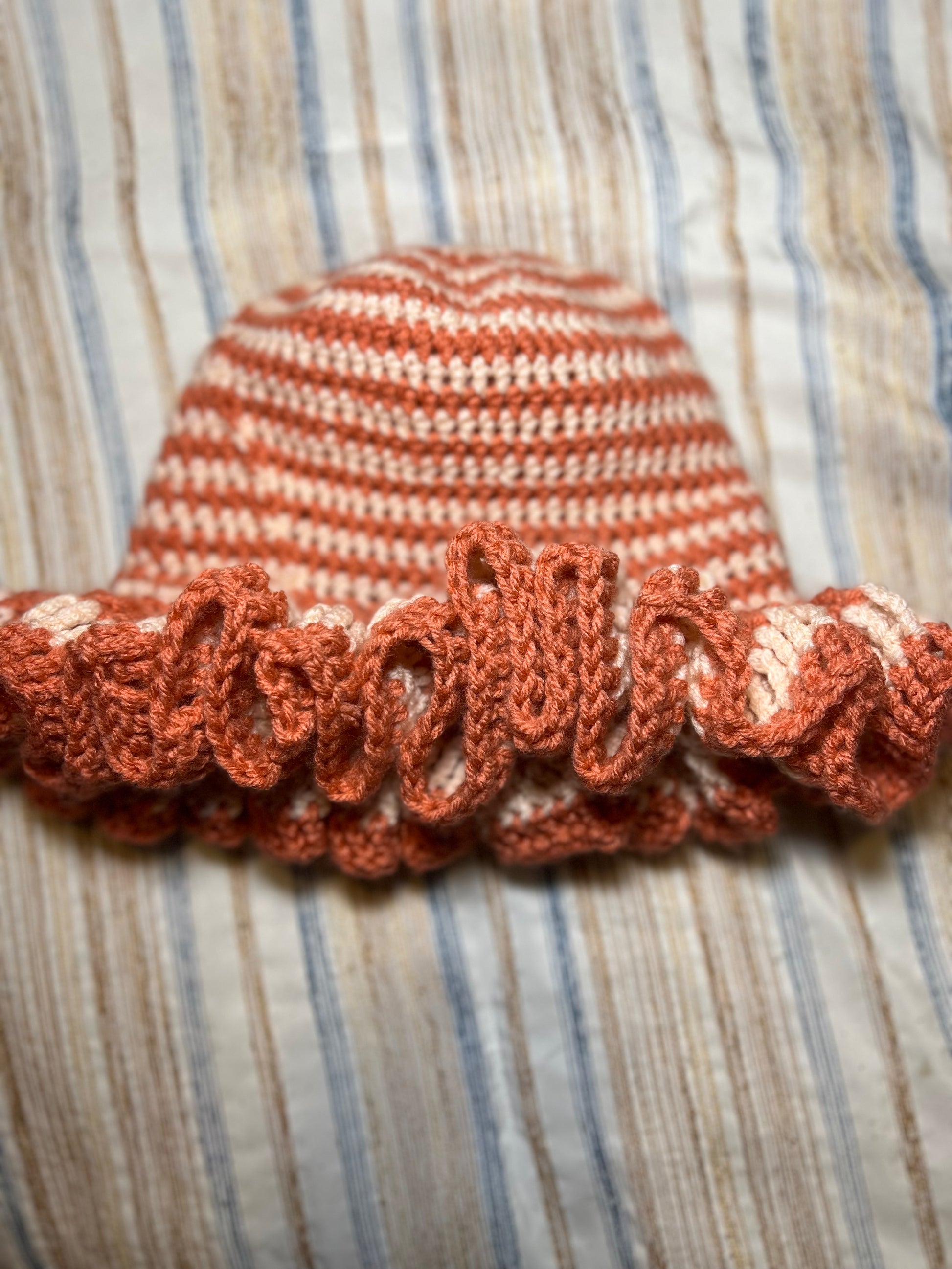 The Peaches and Cream Wavy Ruffle Hat are a stylish, whimsical crochet accessory that perfectly blends charm and elegance. Its color palette features soft, warm peach tones intertwined with creamy off-white hues, reminiscent of a summer sunset or a sweet dessert. The design highlights a wavy texture throughout the body of the hat, giving it a unique and playful aesthetic.